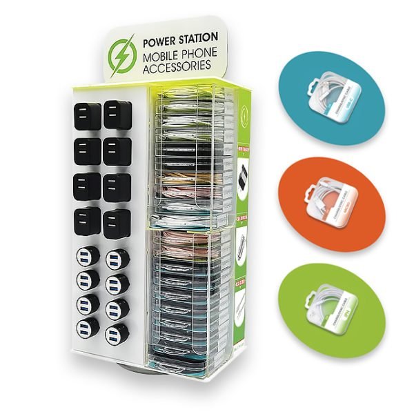 Convenient, attractive and practical Mobile Accessory Display. Each display is fully stocked with 16 Wall Chargers, 16 Auto Chargers and 40 Charging cables sold in bright and assorted colors.