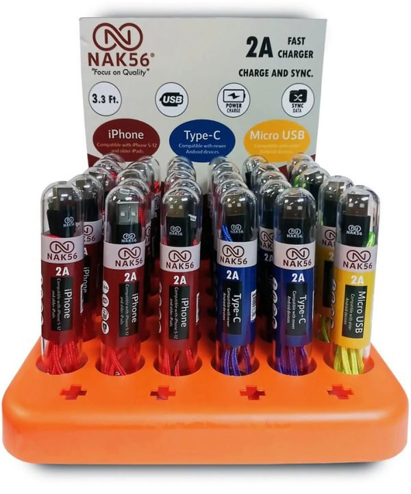 Convenient, attractive and practical Mobile Accessory Display. Each display is fully stocked with 16 Wall Chargers, 16 Auto Chargers and 40 Charging cables sold in bright and assorted colors.